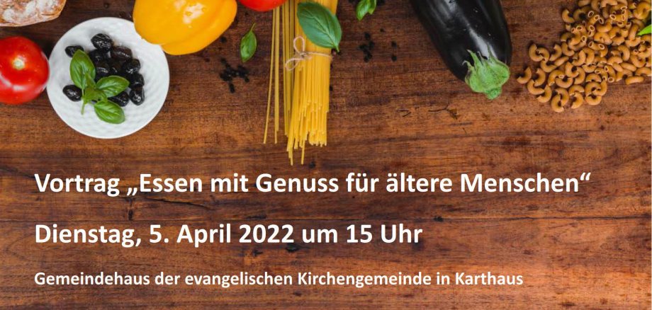 Le début de la série est lancé Mardi 5 avril 2022 à 15h avec le Conférence "Manger avec plaisir pour les seniors" dans la salle paroissiale de la paroisse évangélique de Karthaus. L'oratrice est Bettina Ballat-Klein, experte en nutrition de l'AOK Rhénanie-Palatinat/Sarre.
