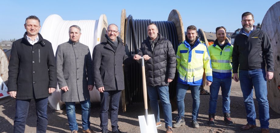 Photo : Ensemble pour le démarrage de la construction du turbo internet dans le district de Konz-Oberemmel : Marco Felten, Rainer Jakobs, Joachim Weber, Hermann-Josef-Benzkirch, Dominik Bosl, Christoph Pütz, Christian Nathem. (Photo : Susanne Nenno/Verbandsgemeinde Konz)