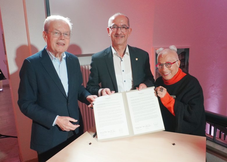 Photo : Norbert Hauser (conseil de fondation), le maire Joachim Weber et Dorothea Hölzer-Magar (conseil de fondation) avec l'accord fraîchement signé entre la ville de Konz et la fondation d'art.
