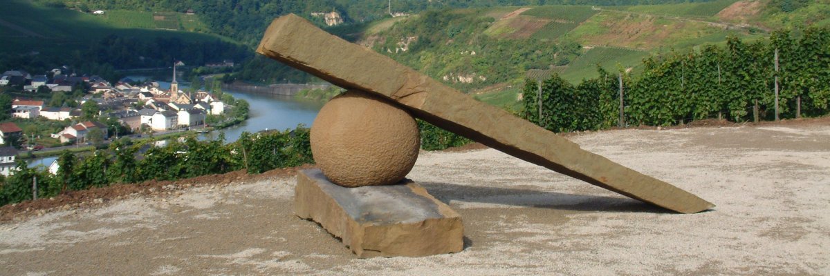 Sous Wasserliesch, nous trouvons le "fragment de tête". Karl-Heinz Deutsch place l'être humain, plus précisément le crâne humain, au centre de son travail sculptural. Sa tête de visière est en grès, mais la surface lisse ne permet aucune concession à la forme naturelle de la pierre. Ici l'artiste se révèle plus sculpteur que sculpteur, car l'œuvre se rapproche de la forme plastique absolue. Fondamentalement, Karl-Heinz Deutsch utilise un langage formel archaïque, qui fait paraître ses œuvres intemporelles et monumentales même dans de petits formats. Les casques ou - dans ce cas - les visières détiennent un secret, il n'y a aucun indice sur ce qui se cache sous la surface. La tête en tant que symbole de ce qui est réellement existentiel, en tant que siège des pensées et en tant que centre de la condition humaine actuelle nécessite une protection particulière.