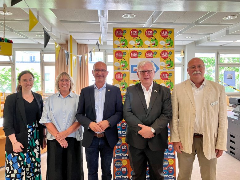 Foto: Aan het begin van de leeszomer - (van links) Julia Michels van de Volksbank, bibliotheekdirecteur Elisabeth Kurzmann, burgemeester Joachim Weber en Hans-Jürgen Bier en Manfred Orth van de LionsClub Saarburg.
