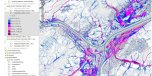 Иллюстрация: Выдержка из карты опасности ливневых наводнений земли Рейнланд-Пфальц ( ЗДЕСЬ ). Уровни воды и скорости потока во время исключительно сильного дождя (SRI 7) продолжительностью D = 1 час.
