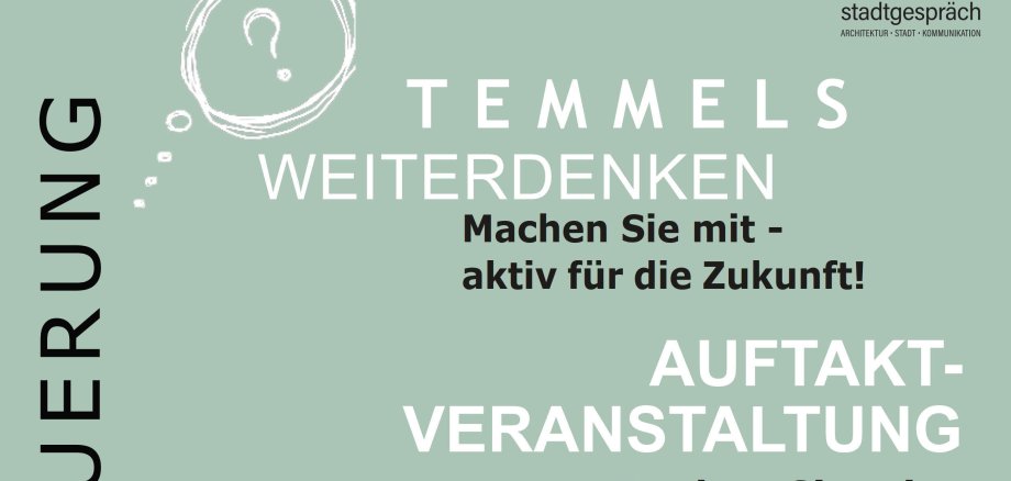 Кроме того, г-жа Юлия Кайзер из уполномоченного бюро планирования «stadttalk» из Кайзерслаутерна предоставит информацию о обновлении деревни в нашем сообществе и дальнейшем ходе процедуры. Еще одним направлением мероприятия является презентация результатов опросной кампании, недавно проведенной в Теммельсе.