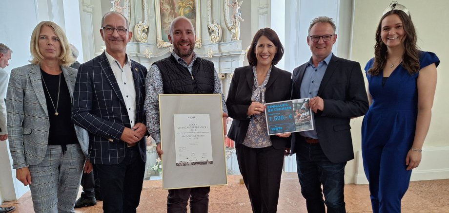 На фото: Стефани Кох (Saar-Obermosel-Touristik), Йоахим Вебер (мэр VG Konz), победитель Патрик Цилликен из Nittel, министр Даниэла Шмитт, Штефан Мецдорф (администратор округа Трир-Саарбург) и королева мозельских вин Сара Рёль.