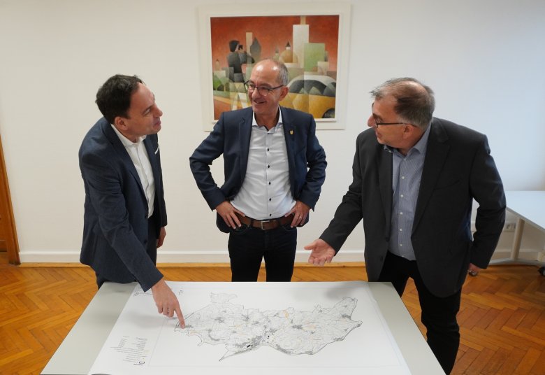 Fotoğraf: (soldan sağa) VG Konz meclis üyesi Guido Wacht, belediye başkanı Joachim Weber ve yeni Verbandsgemeindewerke Konz AöR yönetim kurulu Ralf Zorn, açık alan fotovoltaik konsepti hakkında konuşuyor.