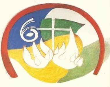 (Mimar: Hermann Baur, Basel, 1959, resim 1969):a) Sunak duvarı, 3.45 x 18.50 m, motif: ruh sembolü. "İnsanlar arasında Tanrı'nın çadırı" (Apoc. 21,3) inşa fikri resim aracılığıyla tamamlanır.Duvar deyim yerindeyse artık orada değildir. Rüzgâr tarafından süpürülmüş gibi yüzen yüzeyler, anlaşılmaz bir derinliği gizler. Sunağı kucaklayan iki parlak, kanat benzeri kavisli renk şeridi ortaya çıkıyor. Çizgilerin ve yüzeylerin yapısındaki düzensiz yer değiştirmeler, dalgalar ve parlak formlar ruhsal enerjiler olarak hissedilir. Eser, Meistermann'ın "kanatlarının" en eskilerinden biridir ve unsurları mimarinin özelliklerini takip eden anıtsal ve geometrik formuyla benzersizdir.